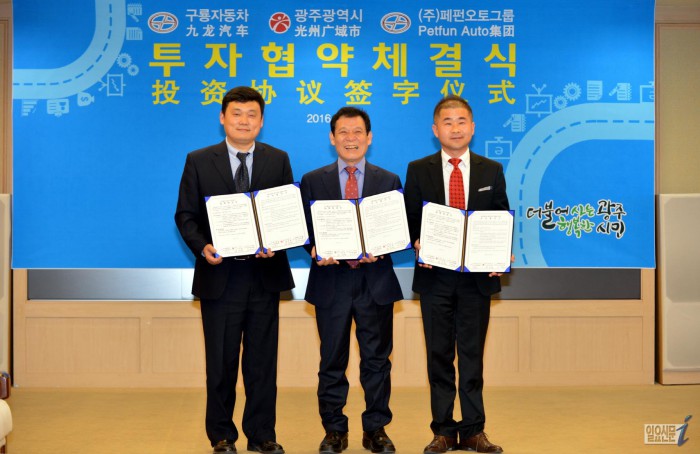 광주시는 16일 시청 비즈니스룸에서 윤장현 시장과 구룡차 린취안홍 국제부 사장, 국내 주관사인 페펀오토그룹 김태혁 대표 등 10여명이 참석한 가운데 투자 양해각서(MOU) 체결식을 가졌다.
