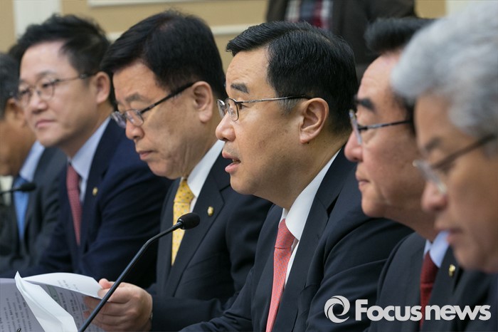 (서울=포커스뉴스) 김정훈(오른쪽 세번째) 새누리당 정책위의장이 17일 오전 서울 여의도 국회에서 열린 규제프리존특별법 제정을 위한 당정협의에 참석해, 모두발언하고 있다.