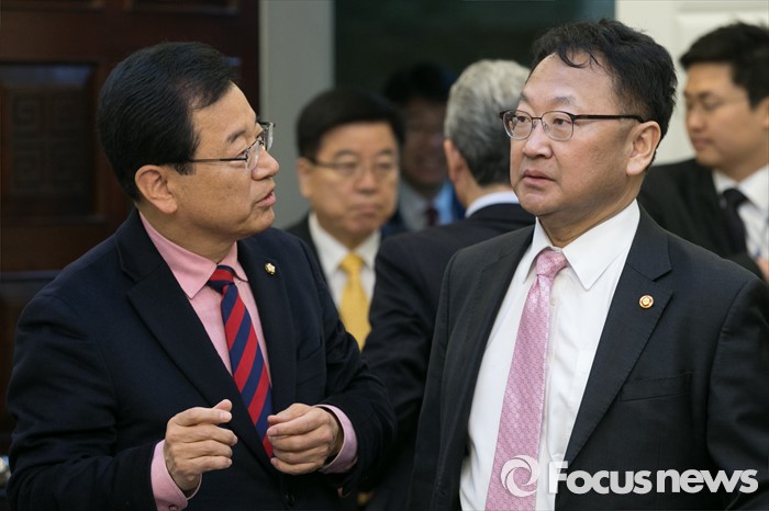 (서울=포커스뉴스) 유일호(오른쪽) 경제부총리 겸 기획재정부 장관관 이현재 새누리당 의원이 17일 오전 서울 여의도 국회에서 열린 규제프리존특별법 제정을 위한 당정협의에 참석해, 대화하고 있다.