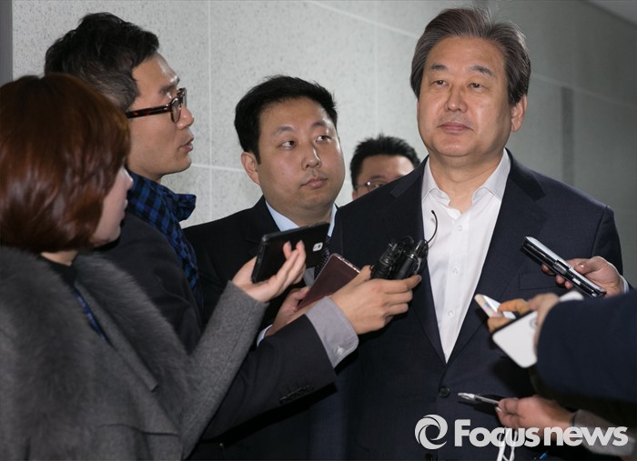 (서울=포커스뉴스) 김무성 새누리당 대표가 17일 오전 서울 여의도 국회 의원회관 의원실로 출근하며 취재진 질문에 답하고 있다.