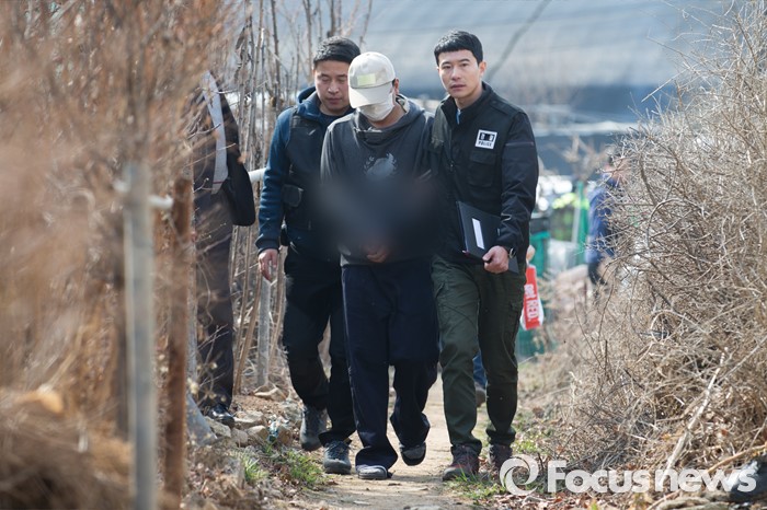 (시흥=포커스뉴스) 시각장애인 아버지를 살해 후 암매장한 아들 이모(37)씨가 17일 오전 경기도 시흥시 자택에서 현장검증을 하기 위해 들어서고 있다.