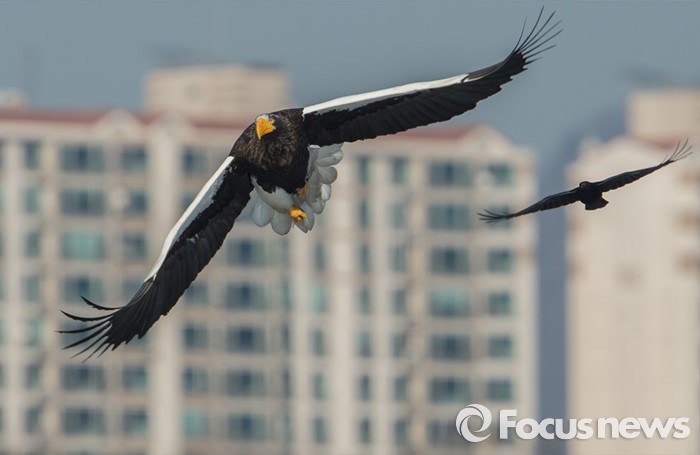 (하남=포커스뉴스) 지난 겨울 한강서 월동한 국제보호조 참수리(천연기념물243호). 지난 3월 9일 하늘 높이 비상하다가 멀리 사라져 고향인 캄차카로 돌아간것으로 보인다.