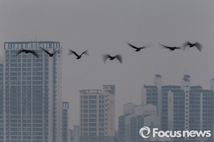 (하남=포커스뉴스) 남녘에서 월동하고올라온 큰기러기들이 한강 휴식을 취한뒤 16일 오후 고향으로 떠나고 있다.