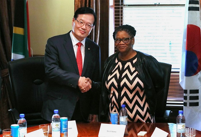(서울=포커스뉴스) 정의화(왼쪽) 국회의장이 16일 오후(현지시각) 남아프리카공화국 의회를 방문해 탄디 모디세(Thandi Modise) 상원의장과 만나 면담에 앞서 기념촬영을 하고 있다. 정 의장은 원전과 해양, ICT 산업 등의 분야에서 한국 기업의 남아공 진출과 투자확대를 위한 지원을 요청했다. <사진제공=국회>
