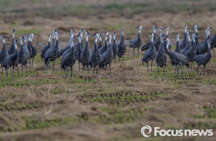 (홍성=포커스뉴스) 일본에서 월동하고 날아온 흑두루미(천연기념물228호)들이 14일 오후 충남 홍성군 천수만에서 고향인 러시아, 중국,몽골로 떠나기에 앞서 먹이를 채우고 있다.