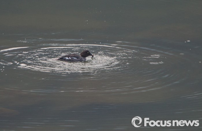 (하남=포커스뉴스) 한강에서 겨울을 보낸 흰뺨오리가 16일 오후 고향으로 떠나기 앞서 다슬기를 잡고 있다.
