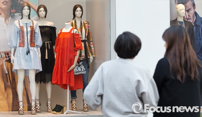 (서울=포커스뉴스) 17일 오전 서울 중구 명동 거리의 쇼윈도우에 봄맞이 옷들이 전시돼 있다.