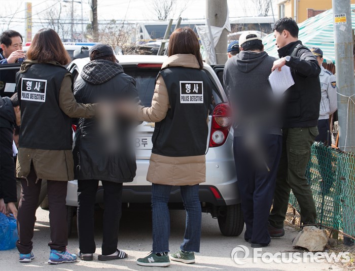 (시흥=포커스뉴스) 시각장애인 아버지를 살해 후 암매장한 아들 이모(37)씨와 어머니 조모(61)씨가 17일 오전 경기도 시흥시 주거지에서 현장검증을 하고 있다.