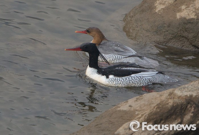 (남양주=포커스뉴스) 희귀조 호사비오리(천연기념물448호) 한쌍이 16일 오후 고향인 러시아의 이만강으로 떠나기 앞서 팔당댐 아래 한강변에서 휴식을 취하고 있다.