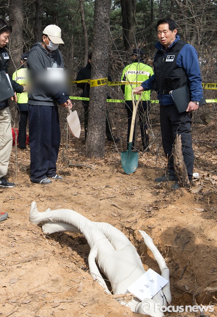 (시흥=포커스뉴스) 시각장애인 아버지를 살해 후 암매장한 아들 이모(37)씨가 17일 오전 경기도 시흥시 대야동 한 야산에서 현장검증을 하고 있다.