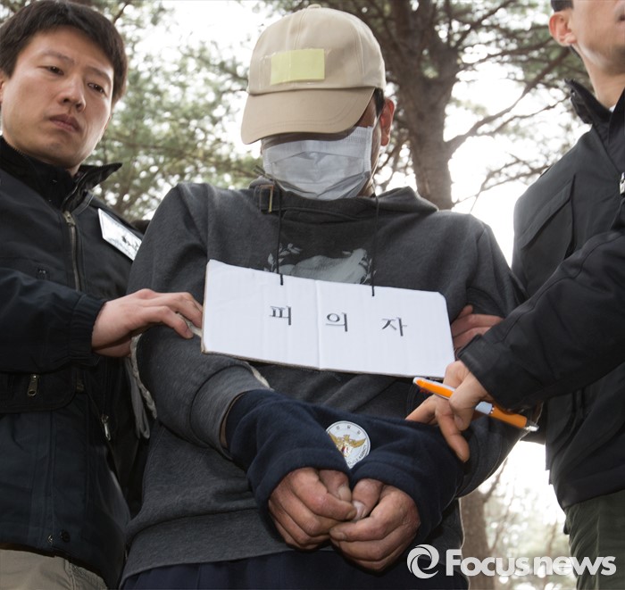 (시흥=포커스뉴스) 시각장애인 아버지를 살해 후 암매장한 아들 이모(37)씨가 17일 오전 경기도 시흥시 대야동 한 야산에서 현장검증을 마친 후 나서고 있다.