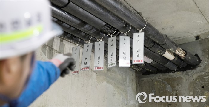 (서울=포커스뉴스) 상부를 지지하던 일부 텐던(대형케이블)이 손상된 것을 발견해 지난달 22일부터 차량 통행이 전면 중단됐던 서울 내부순환로 정릉천고가가 오는 19일부터 통행이 재개된다. 사진은 17일 손상된 일부 텐던을 교체한 모습.