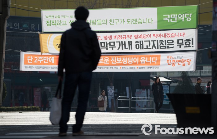 (서울=포커스뉴스) 17일 오후 서울 영등포구 당산역 주변에 다양한 주제를 담고 있는 각 정당들의 정책 홍보 현수막이 걸려 있다.