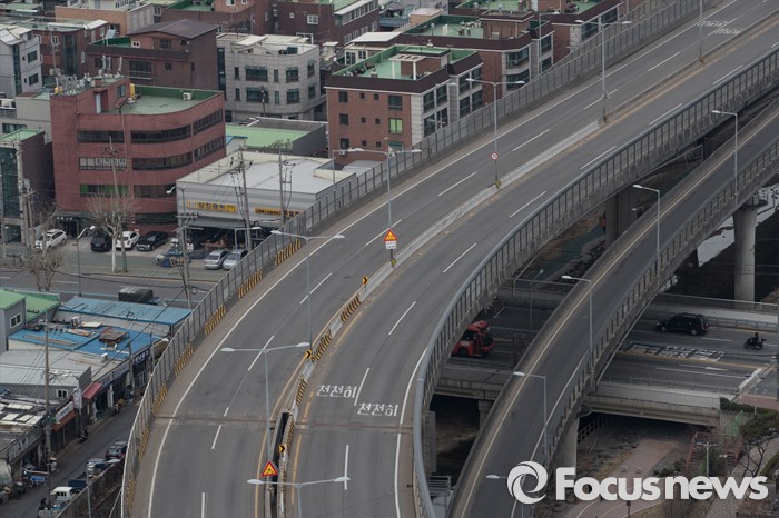 (서울=포커스뉴스) 상부를 지지하던 일부 텐던(대형케이블)이 손상된 것을 발견해 지난달 22일부터 차량 통행이 전면 중단됐던 서울 내부순환로 정릉천고가가 오는 19일부터 통행이 재개된다. 사진은 17일 통제로 텅빈 모습의 서울 내부순환로 정릉천고가.