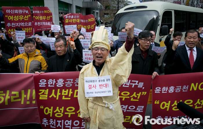 (서울=포커스뉴스) 17일 오후 서울 여의도 새누리당사 앞에서 경남 창원 마산회원구 지역 당원들이 경선을 통해 공천된 윤한홍 예비후보 반대 및 여성우선 공천을 촉구하는 집회를 하고 있다.