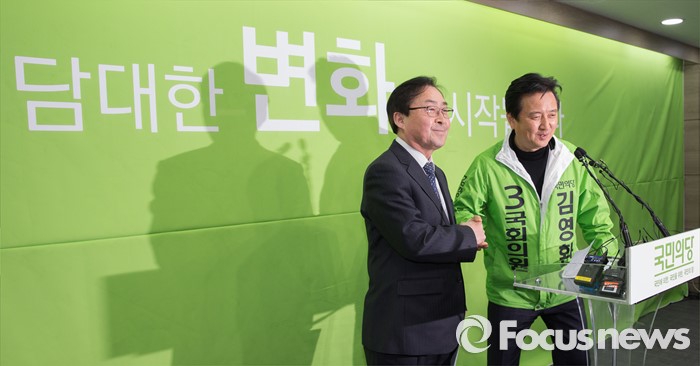 (서울=포커스뉴스) 더불어민주당을 탈당한 부좌현 의원이 17일 오후 서울 국민의당 당사에서 입당 기자회견 개최, 김영환 인재영입위원장과 악수를 하고 있다.