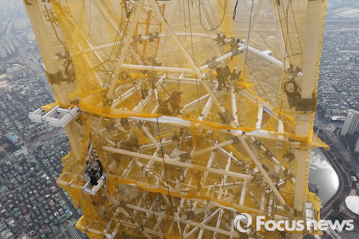 (서울=포커스뉴스) 17일 오후 서울 송파구 잠실 롯데월드타워가 최상층부의 첨탑 구조물 공사를 마치고 국내 최고 높이인 555m에 도달했다. 이날 공사 현장에서 인부들이 작업을 하고 있다.