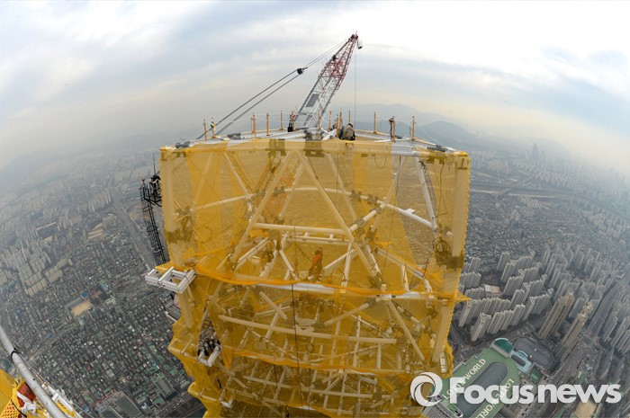 (서울=포커스뉴스) 17일 오후 서울 송파구 잠실 롯데월드타워가 최상층부의 첨탑 구조물 공사를 마치고 국내 최고 높이인 555m에 도달했다. 이날 공사 현장에서 인부들이 작업을 하고 있다.