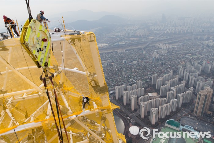 (서울=포커스뉴스) 17일 오후 서울 송파구 잠실 롯데월드타워가 최상층부의 첨탑 구조물 공사를 마치고 국내 최고 높이인 555m에 도달했다. 이날 공사 현장에서 인부들이 작업을 하고 있다.