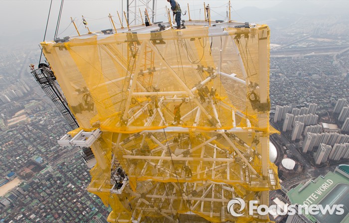 (서울=포커스뉴스) 17일 오후 서울 송파구 잠실 롯데월드타워가 최상층부의 첨탑 구조물 공사를 마치고 국내 최고 높이인 555m에 도달했다. 이날 공사 현장에서 인부들이 작업을 하고 있다.