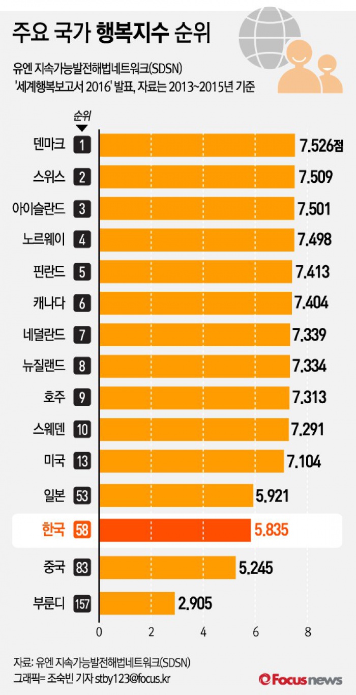 유엔이 16일(현지시간) 발표한 ‘세계행복지수 2016’ 보고서 내용의 핵심이다.