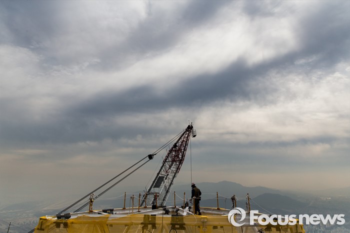 (서울=포커스뉴스) 17일 오후 서울 송파구 잠실 롯데월드타워가 최상층부의 첨탑 구조물 공사를 마치고 국내 최고 높이인 555m에 도달했다. 이날 공사 현장에서 인부들이 작업을 하고 있다.