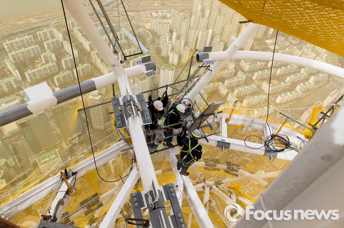 (서울=포커스뉴스) 17일 오후 서울 송파구 잠실 롯데월드타워가 최상층부의 첨탑 구조물 공사를 마치고 국내 최고 높이인 555m에 도달했다. 이날 공사 현장에서 인부들이 작업을 하고 있다.