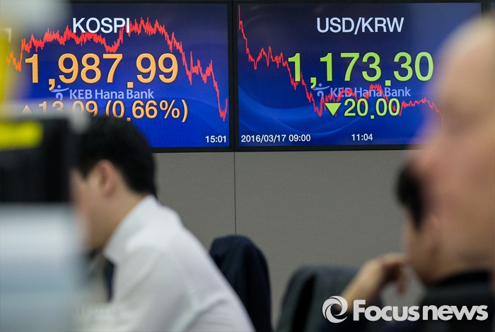 (서울=포커스뉴스) 17일 서울 중구 KEB외환은행 본점 딜링룸 전광판에 코스피지수가 전일보다 13.09p (0.66%) 상승한 1987.99, 원달러환율은 전일 종가 대비 20원 내린 1173.3원를 나타내고 있다. 이날 코스피는 장중 2000선을 돌파했으며, 원·달러 환율은 전일 종가 대비 20원 내린 1173.3원으로 지난해 12월 30일(1172.5원) 이후 약 석달만에 종가 기준 1170원대를 기록했다.