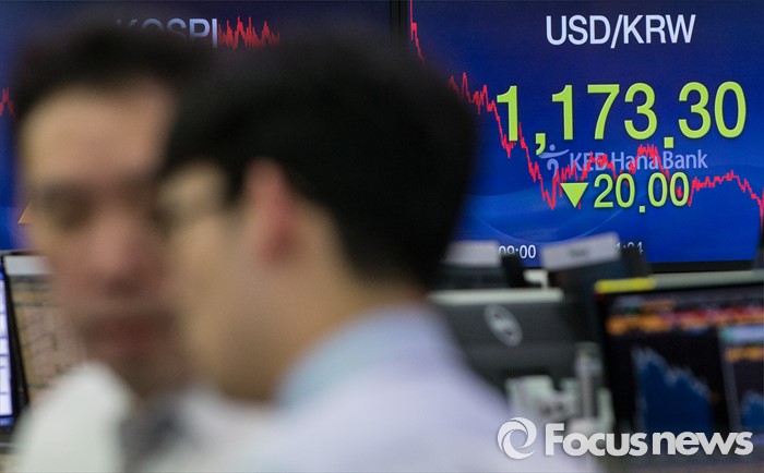 (서울=포커스뉴스) 17일 서울 중구 KEB외환은행 본점 딜링룸 전광판에 원달러환율이 전일 종가 대비 20원 내린 1173.3원를 나타내고 있다. 이날 코스피는 장중 2000선을 돌파했으며, 원·달러 환율은 전일 종가 대비 20원 내린 1173.3원으로 지난해 12월 30일(1172.5원) 이후 약 석달만에 종가 기준 1170원대를 기록했다.