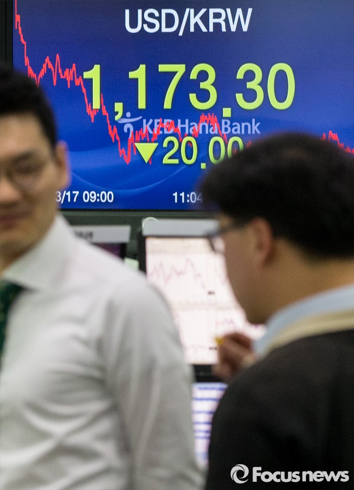 (서울=포커스뉴스) 17일 서울 중구 KEB외환은행 본점 딜링룸 전광판에 원달러환율이 전일 종가 대비 20원 내린 1173.3원를 나타내고 있다. 이날 코스피는 장중 2000선을 돌파했으며, 원·달러 환율은 전일 종가 대비 20원 내린 1173.3원으로 지난해 12월 30일(1172.5원) 이후 약 석달만에 종가 기준 1170원대를 기록했다.