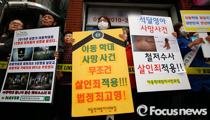 (부천=포커스뉴스) 생후 2개월 영아를 폭행해 숨지게 한 아버지 박모(23)씨와 어머니 이모(23)씨의 현장검증이 실시된 17일 오후 경기도 부천시 오정구 피의자 자택 앞에서 아동학대방지시민모임 회원들이 피의자 살인죄 적용을 촉구하는손피켓을 들고 있다.