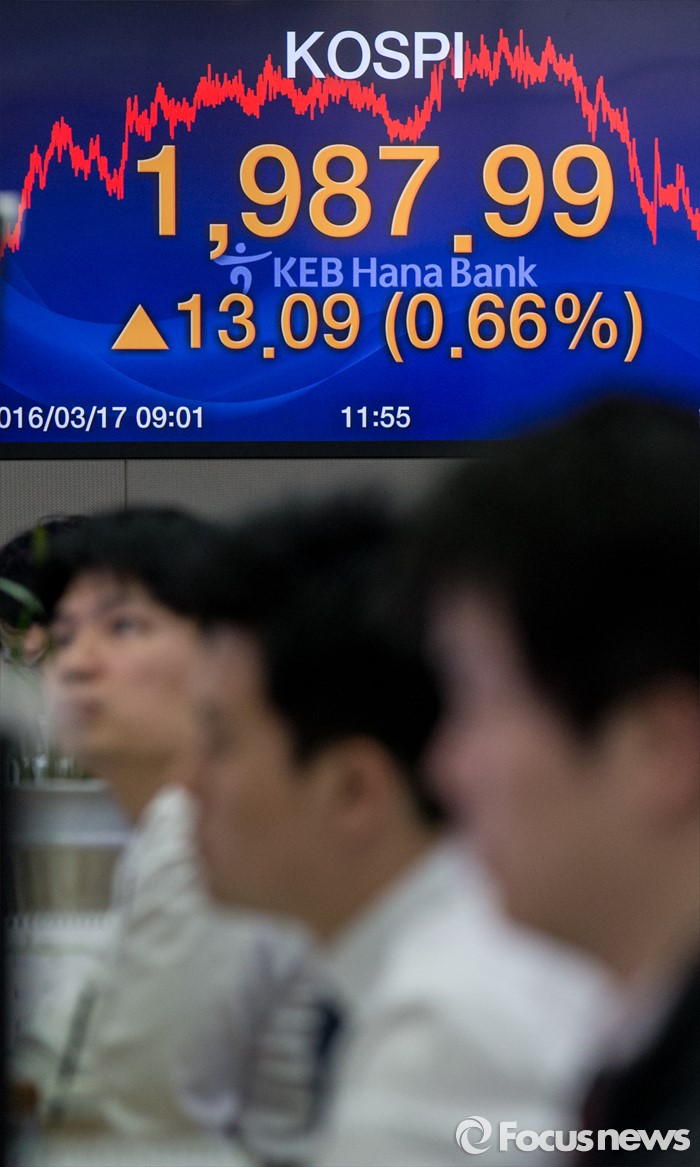 (서울=포커스뉴스) 17일 서울 중구 KEB외환은행 본점 딜링룸 전광판에 코스피지수가 전일보다 13.09p (0.66%) 상승한 1987.99를 나타내고 있다. 코스피는 장중 2000선을 돌파했으며, 원·달러 환율은 전일 종가 대비 20원 내린 1173.3원으로 지난해 12월 30일(1172.5원) 이후 약 석달만에 종가 기준 1170원대를 기록했다.