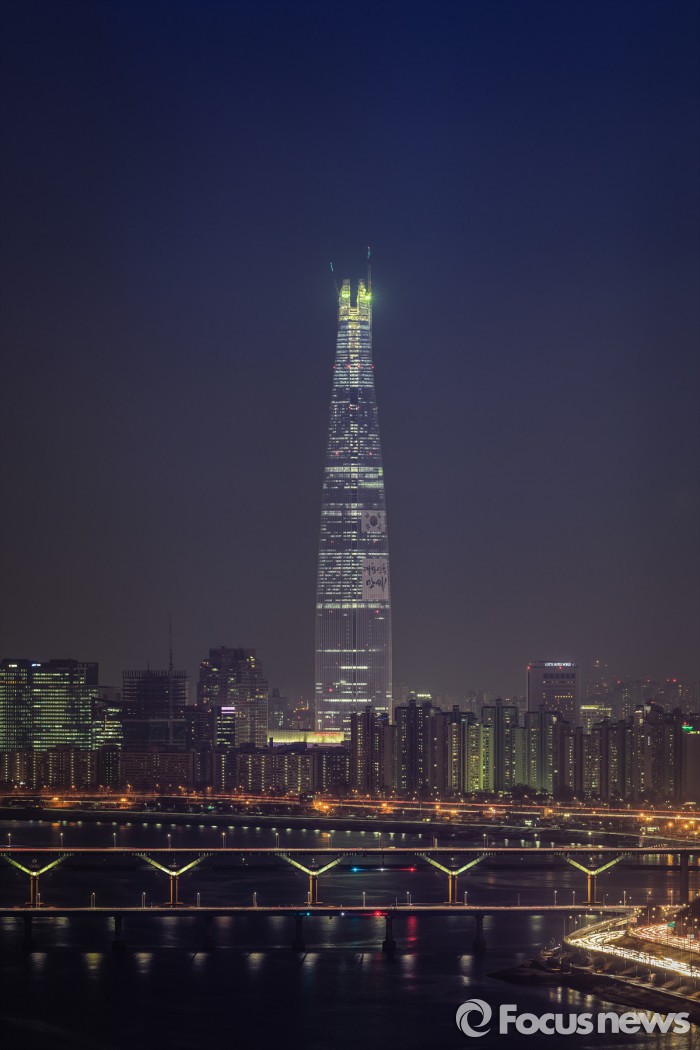 노병용 롯데물산 대표는 “롯데월드타워가 최고 수준의 난이도인 최상층부 랜턴 공사를 안전하게 마무리하고 역사적인 555m에 도달했다”며 “철저정신으로 완공되는 그 날까지 한 치의 오차 없는 시공과 더불어 안전 관리에 만전을 기하겠다”고 말했다.제2롯데월드 타워 야경.<사진제공=롯데물산>롯데월드타워 최상층부에서 국내 최대 64톤급 타워크레인을 활용해 다이아그리드 랜턴 설치 작업을 하고 있다.<사진제공=롯데물산>