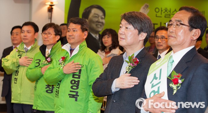 (청주=포커스뉴스) 17일 오후 충북 청주 흥덕구 리호관광호텔에서 열린 국민의당 충북도당 창당대회에서 안철수 공동대표와 당원들이 국기에 대한 경례를 하고 있다.