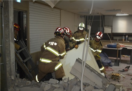 경찰과 소방당국은 정확한 사고 원인을 조사 중이다.17일 오전 4시 30분쯤 서울 도봉소방서 구조대가 도봉구 창동 빌딩에서 내부공사를 하다 벽에 깔리는 사고를 당한 인부 이모(43)씨를 구조하고 있다. <사진제공=서울 도봉소방서>
