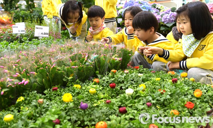 (서울=포커스뉴스) 17일 서울 서초구 하나로클럽 양재점에서 열린 '새봄맞이 봄꽃축제'에서 어린이들이 형형색색의 봄꽃들을 관찰하고 있다. 농협유통은 이번 행사를 통해 수선화 3,000원, 튤립 2,500원 등 다양한 봄꽃을 최대 30% 할인 판매한다. <사진제공=농협유통>