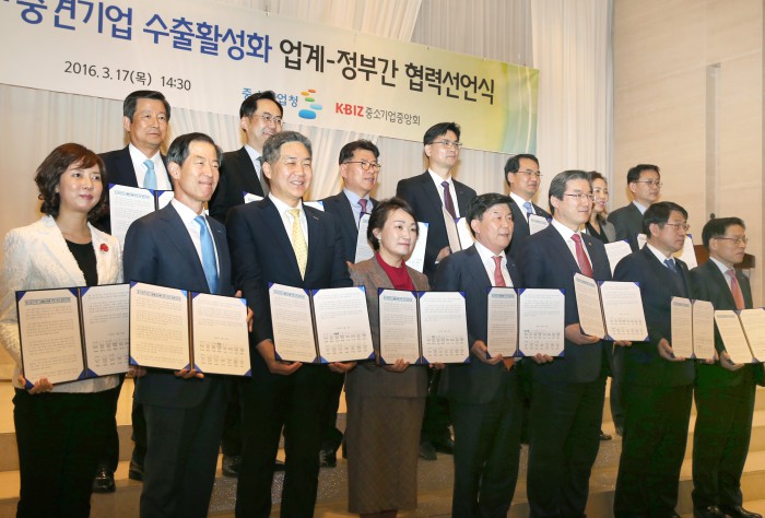 중소기업중앙회(이하 중기중앙회)를 비롯 중소·중견기업단체와 중소기업청, 수출지원 유관기관들은 17일 서울 여의도 중기중앙회 대회의실에서 '중소·중견기업 수출활성화를 위한 민·관 협력' 선언식을 개최했다.