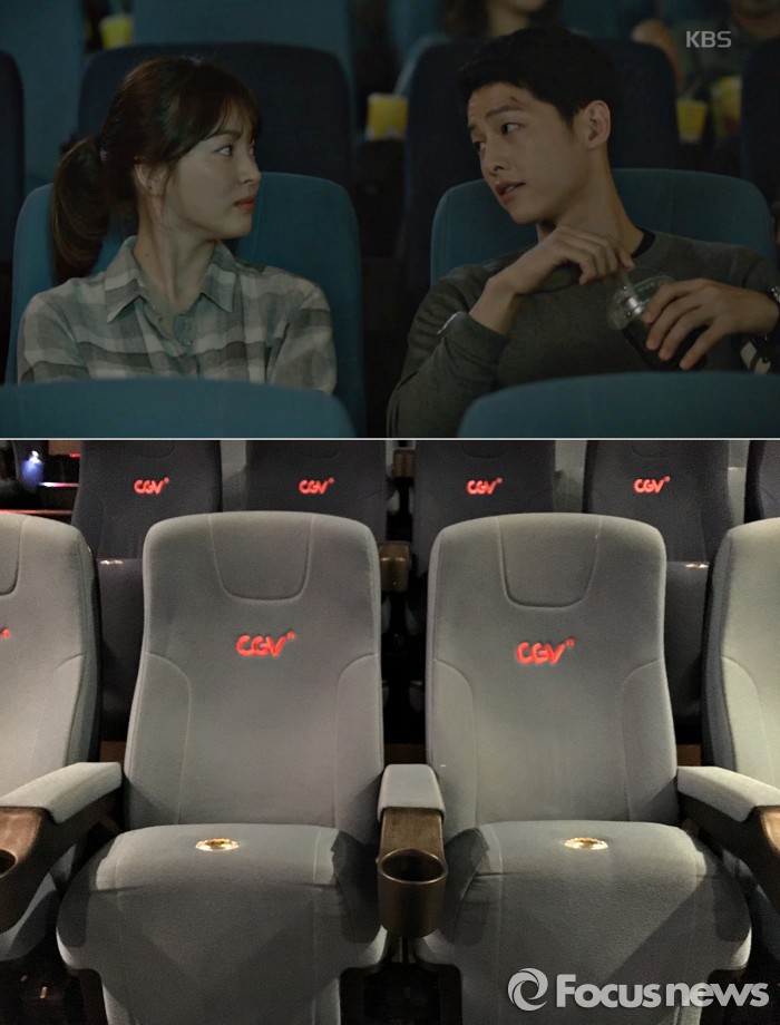 두 사람의 알콩달콩한 영화관 데이트 장면은 서울시 마포구의 CGV 홍대 입구점에서 촬영됐다. '태양의 후예'는 100% 사전제작 드라마다. 영화관 장면은 지난해 여름 촬영을 마쳤다.