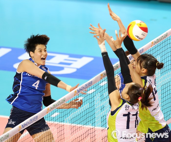 (화성=포커스뉴스) 17일 화성실내체육관에서 열린 2015-2016 V-리그 여자부 챔피언결정전 1차전 IBK기업은행-현대건설 경기에서 IBK기업은행 김희진이 현대건설 양효진과 한유미의 블로킹을 뚫는 스파이크를 날리고 있다.