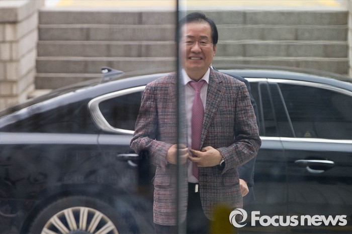 (서울=포커스뉴스) 18일 오전 서울 서초구 서울중앙지방법원에서 고(故) 성완종 전 경남기업 회장으로부터 불법 정치자금을 받은 혐의로 기소된 홍준표(62) 경남도지사가 4차 공판에 출석하고 있다.