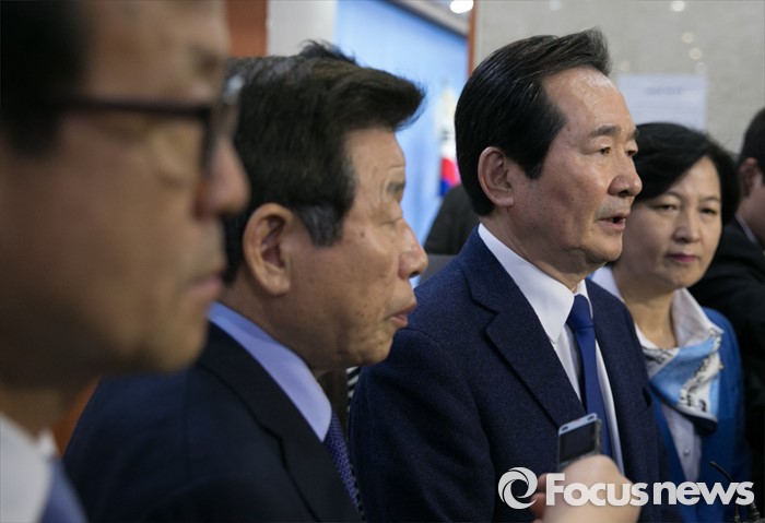 (서울=포커스뉴스) 더불어민주당 중진 의원들이 18일 오전 서울 여의도 국회 정론관에서 수도권 중심 야권 연대를 촉구하는 기자회견을 마친 뒤 취재진 질문에 답하고 있다. 왼쪽부터 원혜영, 유인태, 정세균, 추미애 의원.