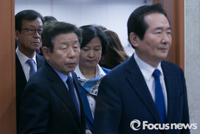 (서울=포커스뉴스) 더불어민주당 중진 의원들이 18일 오전 서울 여의도 국회 정론관에서 수도권 중심 야권 연대를 촉구하는 기자회견을 마친 뒤 퇴장하고 있다. 왼쪽부터 원혜영, 유인태, 추미애, 정세균 의원.