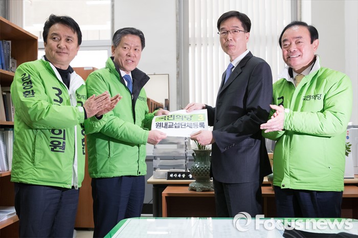 (서울=포커스뉴스) 18일 오전 서울 여의도 국회에서 국민의당 김영환(왼쪽부터) 인재영입위원장, 주승용 원내대표, 장병완 정책위의장이 국회의사국 관계자에게 원내교섭단체등록서를 제출하고 있다.