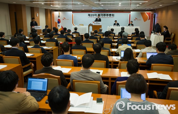 (서울=포커스뉴스) 조대식 사장이 18일 오전 서울 중구 SK본사에서 열린 제 25차 정기 주주총회에서 의장을 맡아 인사말을 하고 있다. 이번 주총에서 최태원 SK그룹 회장의 등기이사 선임안건이 가결됐다.