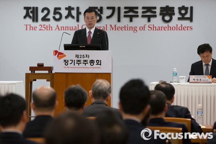 (서울=포커스뉴스) 조대식 사장이 18일 오전 서울 중구 SK본사에서 열린 제 25차 정기 주주총회에서 의장을 맡아 인사말을 하고 있다. 이번 주총에서 최태원 SK그룹 회장의 등기이사 선임안건이 가결됐다.