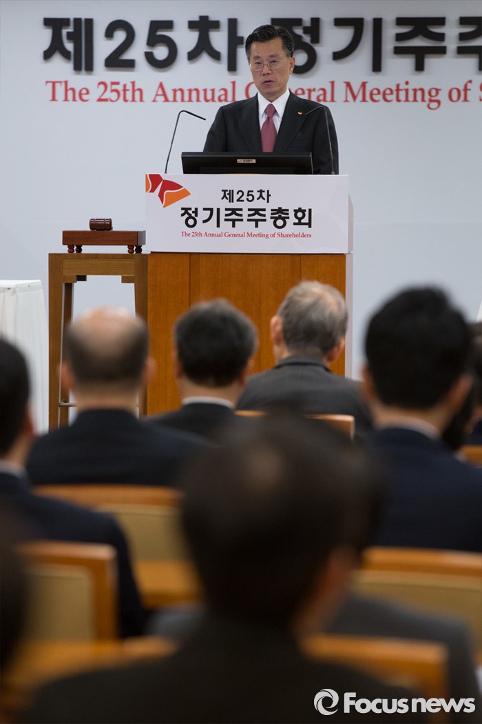 (서울=포커스뉴스) 조대식 사장이 18일 오전 서울 중구 SK본사에서 열린 제 25차 정기 주주총회에서 의장을 맡아 인사말을 하고 있다. 이번 주총에서 최태원 SK그룹 회장의 등기이사 선임안건이 가결됐다.