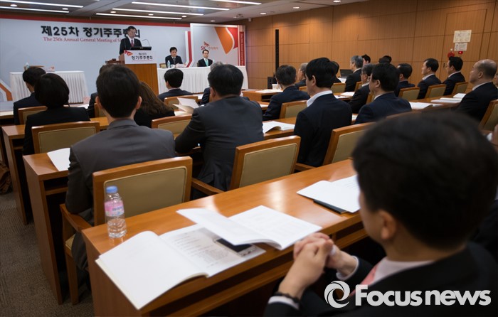 (서울=포커스뉴스) 조대식 사장이 18일 오전 서울 중구 SK본사에서 열린 제 25차 정기 주주총회에서 의장을 맡아 인사말을 하고 있다. 이번 주총에서 최태원 SK그룹 회장의 등기이사 선임안건이 가결됐다.
