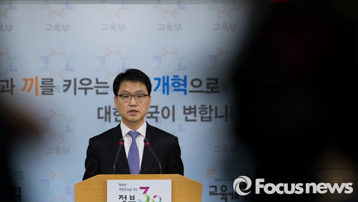 (서울=포커스뉴스) 18일 오전 서울 종로구 정부서울청사 브리핑룸에서 이승복 교육부 대변인이 일본 고등학교 사회 교과서 검정결과에 대한 규탄 성명을 발표하고 있다.