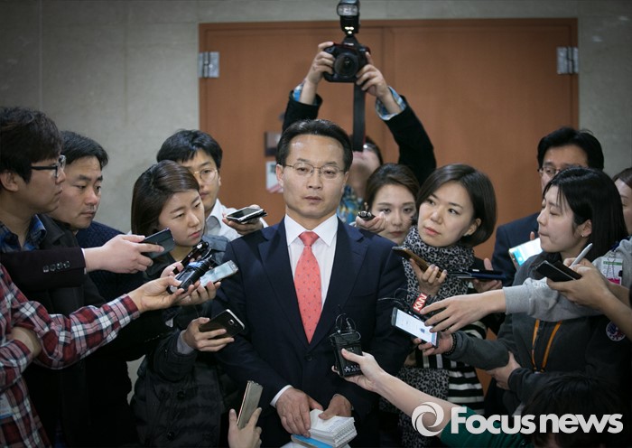 (서울=포커스뉴스) 공천 탈락한 조해진 새누리당 의원이 18일 오전 서울 여의도 국회 정론관에서 탈당 및 20대 총선 무소속 출마 기자회견을 마친 뒤 취재진 질문에 답하고 있다.