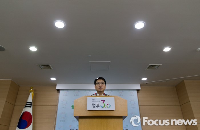 (서울=포커스뉴스) 18일 오전 서울 종로구 정부서울청사 브리핑룸에서 이승복 교육부 대변인이 일본 고등학교 사회 교과서 검정결과에 대한 규탄 성명을 발표하고 있다.